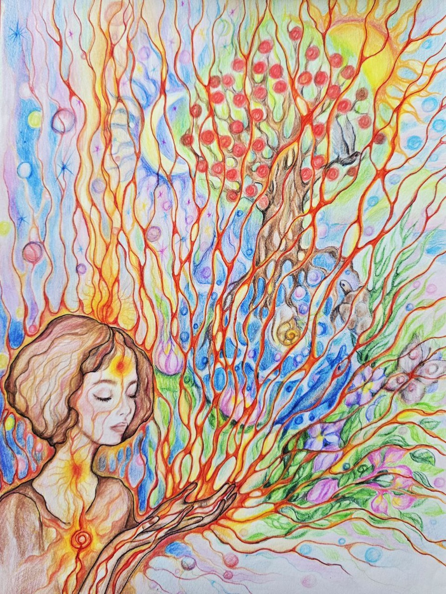 Lelena Текст Натальи Красовой Однажды я встретила ветер, теперь вспоминаю его ладонями 🙌 Этот момент "встречи с ветром" для меня это встреча с Вдохновением, с невидимой силой, которая коснулась меня ещё в детстве . Вдохновение пришло внезапно, как порыв ветра, как нежный бриз или как ураган. Оно затронуло так глубоко всю меня, пробуждая чувства, образы и мысли. И я начала рисовать, рисовала карандашами, красками, мелками, углем......через линии , мазки, штрихи "материализовывала" то неосязаемое чувство . "Воспоминание ладонями" – это трансформация искры в ощущения, образы, интуитивное обращение к чувственной памяти, а затем преобразование в импульс, который проходит по телу к рукам, ладоням, а затем на бумагу или холст. Я думаю, что этот короткий верлибр – "идеальная метафора творческого процесса"!!!💖 И размышляя об этом дальше, пришло то, что у руки пять пальцев, как пять чувст и шестое чувство интуиция в виде глаза, поэтому через руки, а точнее ладошки, идёт божественна