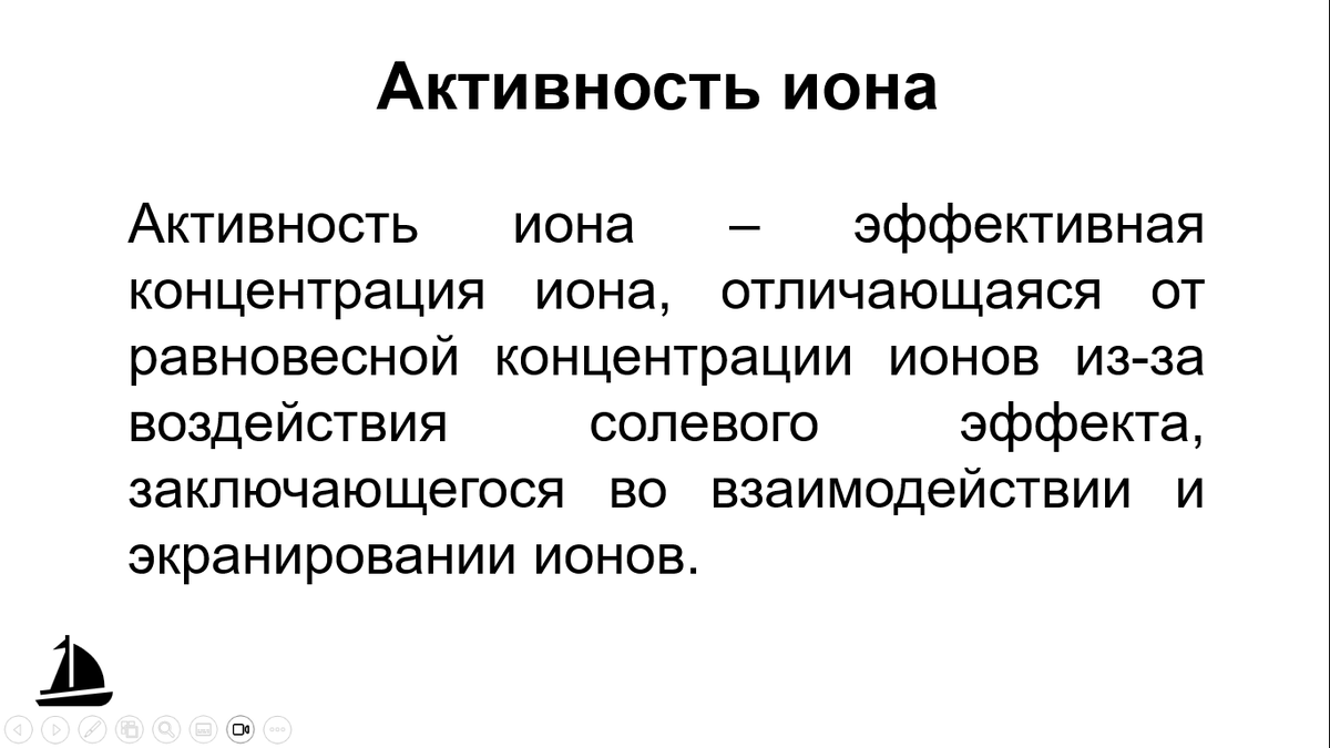 Принцип Ле-Шателье описывает смещение равновесия в зависимости от концентраций веществ или ионов, находящихся в равновесии. Однако, ионы, непосредственно не участвующие в равновесии также влияют на положение равновесия. Наличие таких ионов приводят к улучшению растворимости осадков и к усилению диссоциации слабых электролитов. Это происходит из-за понижения эффективной концентрации или, так называемой активности ионов аналита. Это явление носит название "солевой эффект" и тем сильнее, чем больше заряды ионов. Активность ионов можно вычислить, зная их концентрацию и коэффициент активности. При низких концентрациях эффект солевой эффект очень слабый, поэтому коэффициент активности будет почти равен 1. При более высоких концентрациях (причем речь идет о концентрациях всех ионов и участвующих в равновесии и посторонних) коэффициент активности и, соответственно, сама активность убывает. Для расчета коэффициентов активности нам понадобится вначале рассчитать ионную силу. Это обобщенная мера