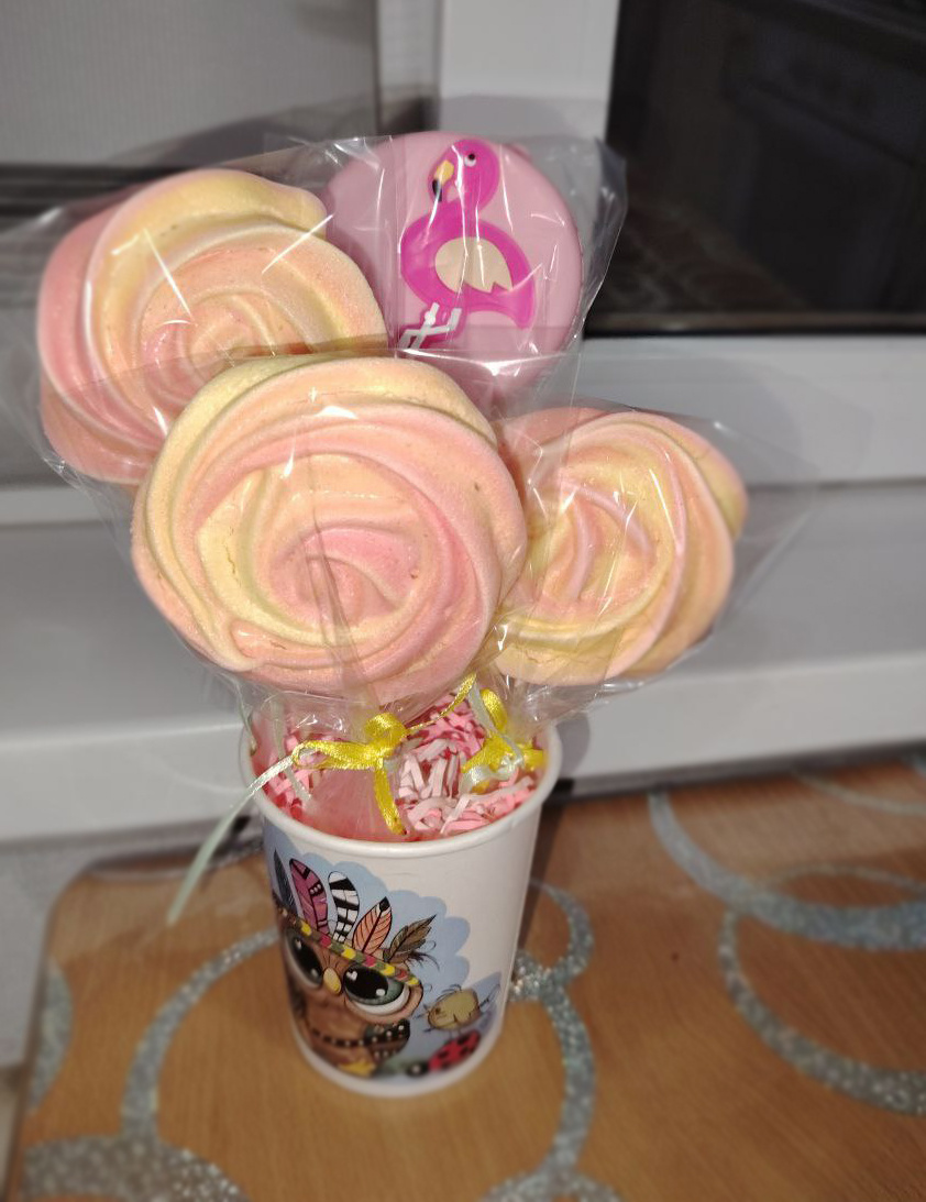 Очень рада, что мне с первого раза попался идеальный рецепт меренги! С его помощью оформила подарок племяшке (три меренги на палочке, кошелечек, оформленные в единую композицию-букет). Сделала еще маленькие безешки, украсила ими торт-цифру, но об этом потом... Пока рецепт меренги. Ингредиенты: Приготовление: 1. Отделите белки от желтков. Это примерно 3 яйца. Можно взять пополам сахар и сахарную пудру. В чашку миксера положите белки. Я взяла из холодильника. Добавьте сразу в белки несколько капель лимонного сока. Взбивайте белки на средней скорости до легких пиков. Это обязательно. Белки таким образом обогащаются кислородом. 2. Далее включите миксер на полную мощность и взбивайте, добавляя сахарную пудру по 1ч.ложке. С интервалом 10 секунд. 3. Когда пудра закончится, взбивайте еще 5 минут. Меренга готова, она выглядит блестящей и сахарная пудра вся должна раствориться. 4. Поделите нашу массу на 2 части (или больше, по желанию). 5. Добавьте по несколько капель пищевой краски (у меня отд