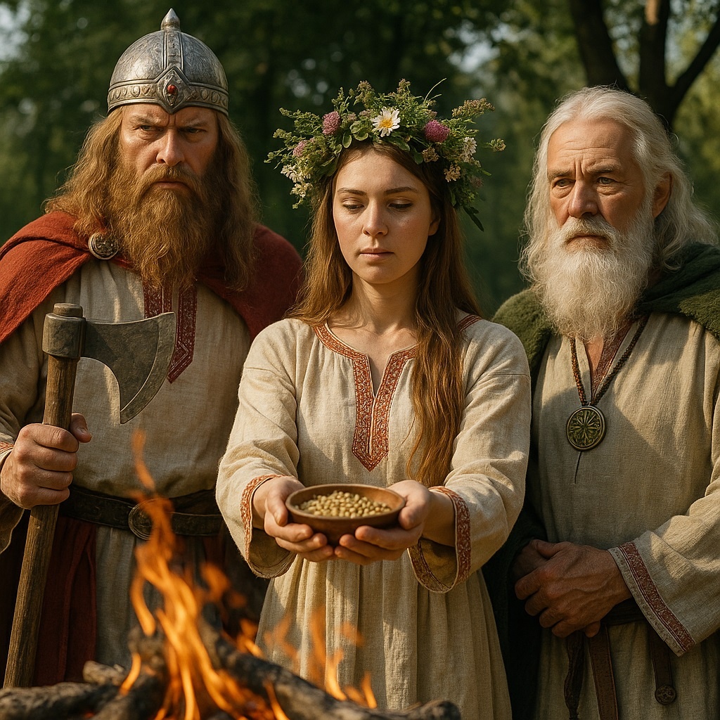 Перун — бог-громовержец. Символ мужества, боевого духа, воинской доблести. В его честь славяне устраивали не просто молебны. Это были мощные ритуалы, наполненные страхом, уважением и адреналином. На высоких холмах строились святилища, чаще всего в форме кола или деревянного столба с вырезанным лицом. В дни Перуна — в особенности в разгар лета, перед жатвой — приносили жертвы: куски мяса, мёд, напитки, но не только. Мужчины совершали обряды очищения в огне, прыгали через костры, били друг друга посохами — чтобы дух Перуна вошёл в них и очистил от слабости.