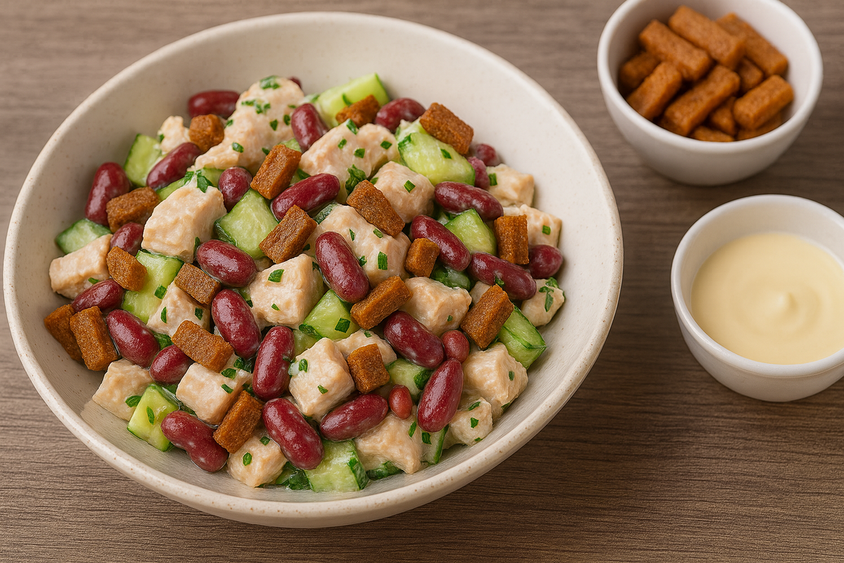 Иногда на обед совершенно не хочется горячего супа или сложного гарнира — хочется чего-то простого, вкусного и сытного. Именно для таких случаев идеально подойдёт этот салат. В нём есть всё, что нужно: белок из курицы и фасоли, полезные углеводы из сухариков, свежесть от огурца и лёгкая пикантность от чеснока. Готовится он буквально за 10 минут, особенно если у вас уже есть отварное или запечённое куриное филе. Такой салат можно взять с собой на работу, подать к ужину или даже приготовить на праздник — сытно, вкусно и без лишних хлопот. Если у вас уже есть готовое куриное филе — просто нарежьте его небольшими кубиками или разберите на волокна.