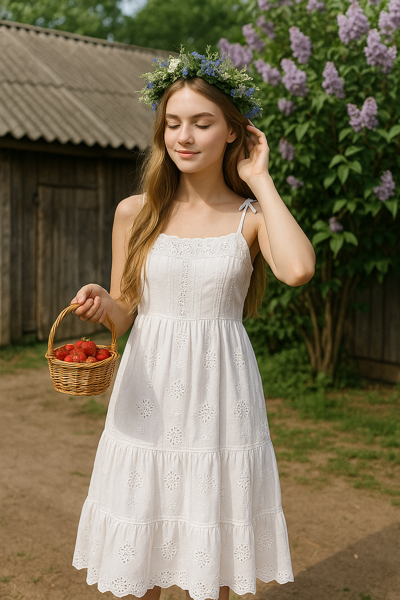 На ней был длинный льняной сарафан с оборками, а на голове — искусственный венок, который она заказала в интернете «для фотосессий в деревне». В руке — лукошко, наполненное клубничками.