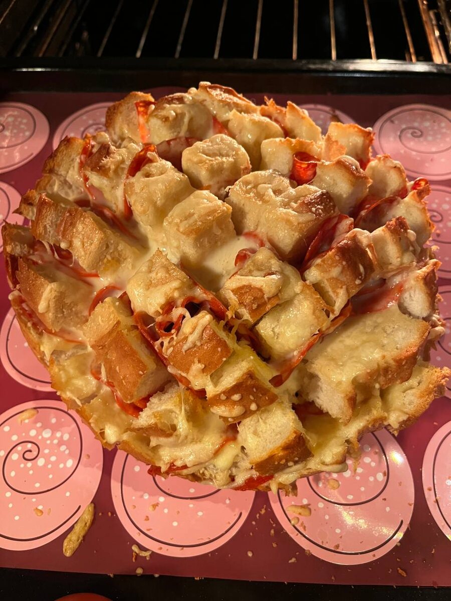Кажется, я нашла ещё одну супер простую и быструю закуску — особенно для тех случаев, когда гости вот-вот придут, а вы совсем не готовы. Заказывать доставку — долго, а тут всё делается быстро и из простых продуктов. Ингредиенты: • батон или круглый хлеб (у меня был большой круглый) • сливочное масло — 30 г • чеснок — 3–4 зубчика • тертый сыр — 100 г (можно заменить ломтиками) • колбаса — около 150 г (у меня была пачка нарезки) Как готовить: • Разогрейте духовку до 200°C. • Нарежьте хлеб по принципу шахматной доски — крест-накрест, не дорезая до конца. • Растопите сливочное масло в микроволновке, добавьте к нему измельчённый чеснок. • Аккуратно смажьте все надрезы хлеба чесночным маслом. • Вложите в надрезы кусочки колбасы. • Заполните разрезы сыром (именно внутрь, а не сверху — чтобы не пригорел). • Поставьте в духовку на 15 минут. На выходе — сытная, ароматная, необычная закуска, которая всегда вызывает восторг. Быстро, просто и очень вкусно. КБЖУ (на 100 г): 362.9 ккал • Б 15.4 г •