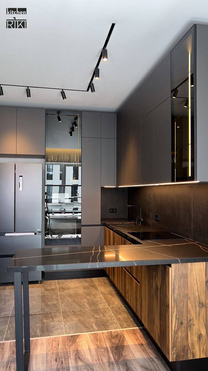 П-образная кухня с полуостровом в ЖК "Вестердам»! История началась с мечты молодой пары о стильной кухне — темной, с полуостровом, деревянными акцентами и благородной каменной столешницей. Мы с радостью взялись за воплощение их идеала, и вот что получилось. Главным вызовом стали уже установленные трековые светильники — нужно было идеально вписать кухню до потолка, чтобы дверцы не задевали осветительные элементы. Наши мастера блестяще справились с этой задачей, рассчитав каждый миллиметр. В результате кухня заняла свое место безупречно, без единой переделки. Темные фасады в сочетании с натуральным деревом создают атмосферу современной роскоши. Полуостров стал не только функциональной зоной, но и стильным акцентом интерьера. А каменная столешница добавила ноту благородства и практичности. Особое внимание мы уделили освещению — оно подчеркивает фактуру материалов и создает уютную атмосферу. Теперь это не просто кухня, а настоящее сердце дома, где приятно готовить, собираться с близким