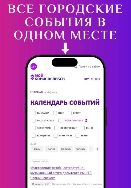 Теперь, зайдя на официальный сайт сетевого издания «Мой Борисоглебск», одним кликом перед вами откроется полный перечень интересных мероприятий города. Больше никаких «а почему не было анонса?», «а кто вообще знал, что будет концерт?»! 🤷♂️ Мы это исправили и собрали все афиши мероприятий в одном месте — выбираете интересующее событие и вперед навстречу культурному отдыху! 🎭🙃✨