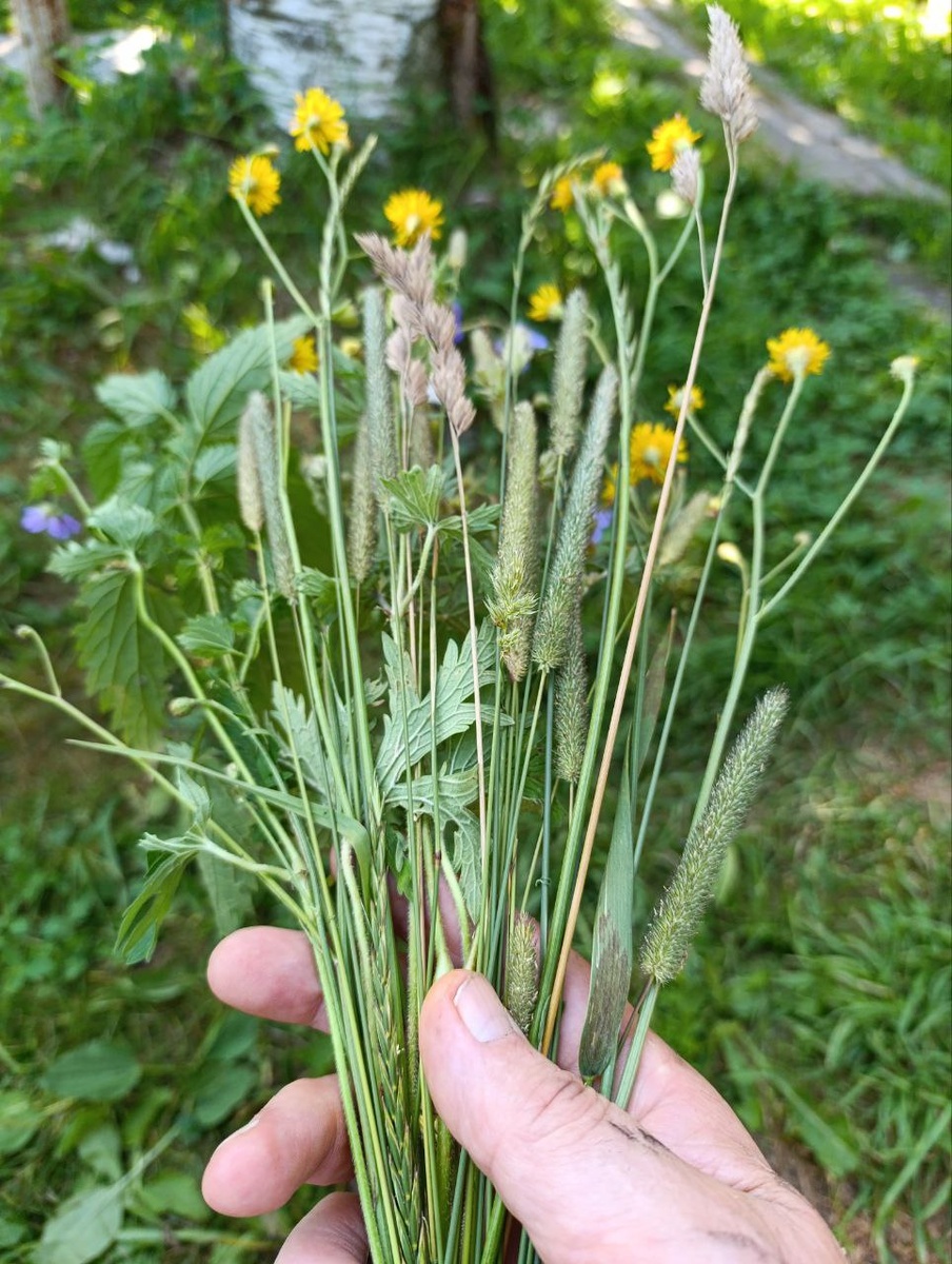 Глебка зачерпнул пригоршню травы из валка, разобрал по травинке в букетик, сощипнул по пути верхушку крапивы.