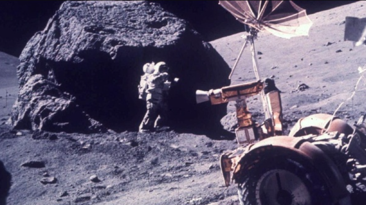Эту фотографию, утверждает НАСА, сделала миссия "Аполлон-17" на Луне в 1972 году. В кадре красуется огромный валун. И, разумеется, лунонавт тоже красуется.