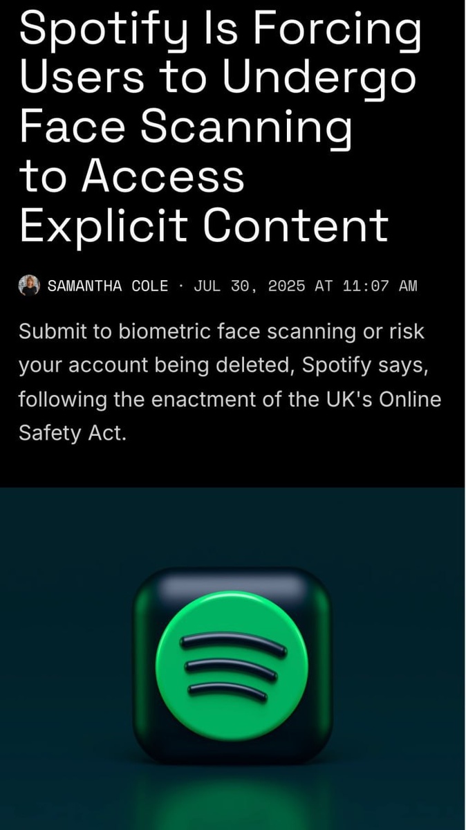 Spotify по паспорту и с 18 лет — в Великобритании запретили несовершеннолетним СЛУШАТЬ МУЗЫКУ В Британии происходит настоящая дурка, рассказываем: • Это не глупая шутка и не ошибка — новые правила уже вступили в силу • Теперь КАЖДЫЙ пользователь из Британии обязан подтвердить свой возраст • Придётся показать документы, а ещё и просканировать своё лицо • Каждому, кто не пройдёт проверку, просто СНЕСУТ аккаунт в течение 90 дней • Дурдом происходит из-за свежего закон «О безопасном интернете» • Простыми словами, это, без преувеличения, цифровой Гулаг: в стране ввели порно по паспорту, платформы обязаны сами удалять грубые шутки, контент про секс, наркотики, религию и даже критику власти • Насколько всё абсурдно: в Великобритании блокируется даже слово porn в соцсетях • Британцы массово качают VPN — часть из них пытается открыть заблокированные ресурсы через Россию • Причиной безумного закона, как обычно, выставляют «защиту детей» Даже РКН завидует этим умникам