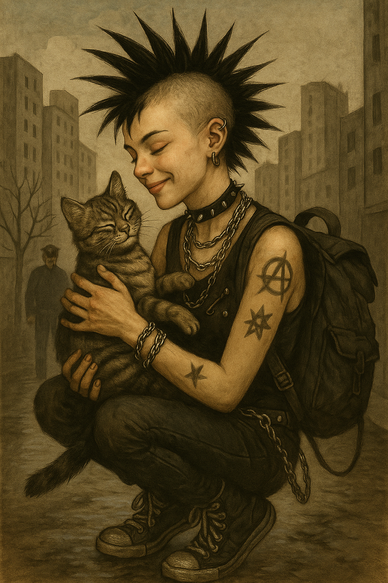 Однажды, в сером как студень, утреннем мегаполисе, где даже воробьи кашляют от безысходности, проснулась девочка-панк по имени Лада-Монстр. Проснулась она не потому что хотела — просто кошка по кличке Урса Психоделика решила, что время для панк-мессы пришло и с разбега прыгнула ей на живот. Урса, к слову, выглядела как будто вчера устроила мятеж на помойке, победила, но морально пострадала. Лада протянула руку, чтобы её погладить, но кошка хлестнула по ней лапой, оставив след, как от берлинского граффити — дерзко, кроваво, бессмысленно.