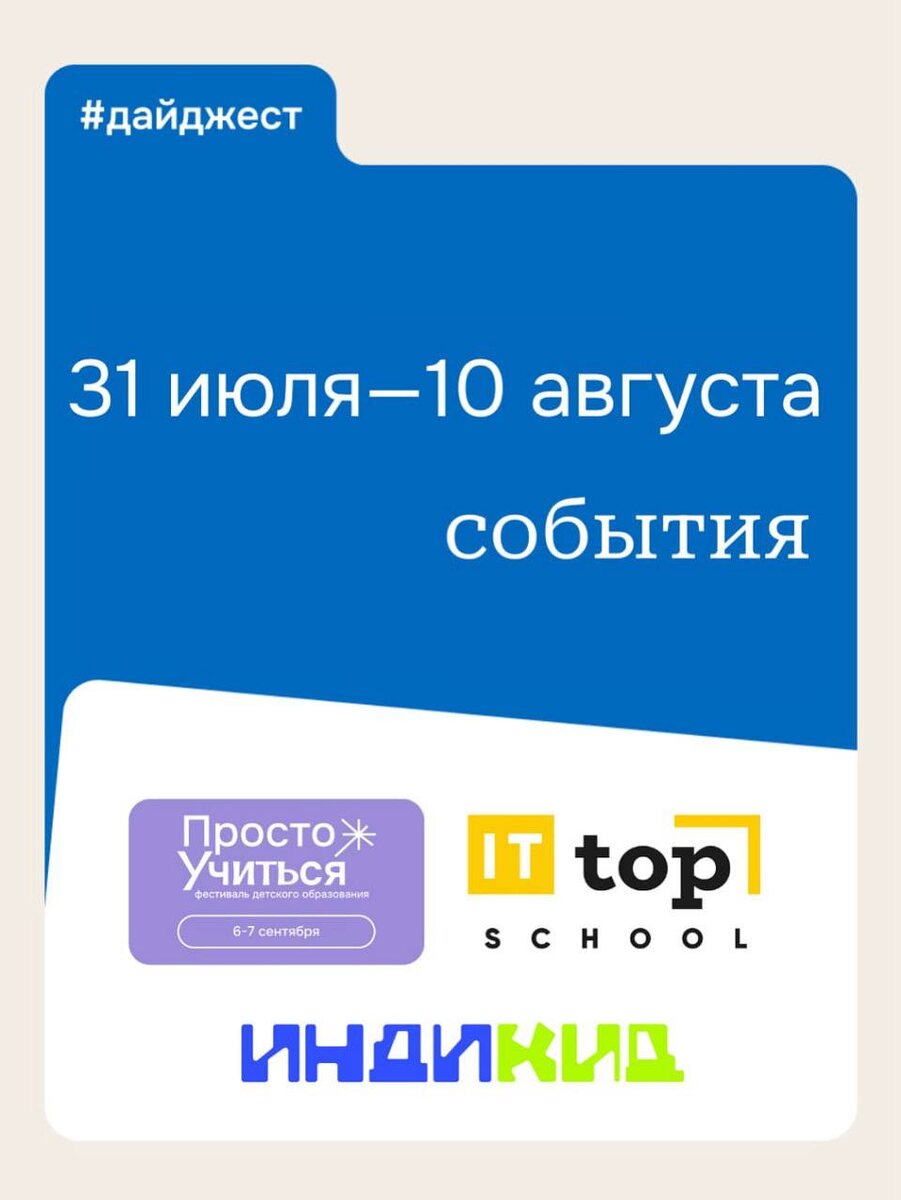 Впереди ещё один месяц лета и возможность найти то самое место, чтобы с радостью пойти в школу 1 сентября, ну, и, конечно, уже можно зарегистрироваться на Фестиваль детского образования «Просто Учиться» • 7 августа День открытых дверей в школе ИндиКид Крестовский остров https://vk.cc/cO4oEq • 9 августа 12.00 День открытых дверей в TOP IT SCHOOL Московский район https://vk.cc/cwNq75 • 6-7 сентября Фестиваль детского образования «Просто Учиться» Севкабель Порт https://vk.cc/cO4oUE Ещё больше событий и летних программ на нашем сайте в Календаре событий.