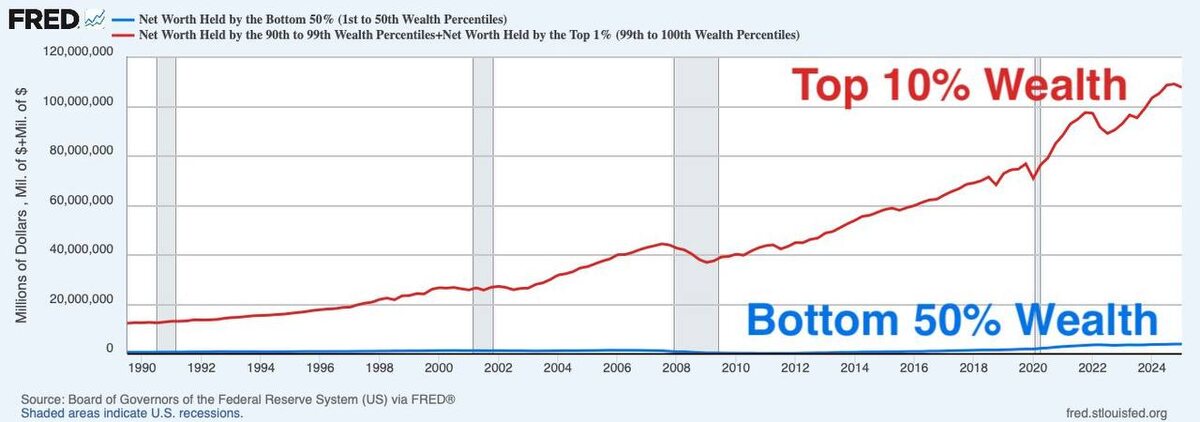 Это не про богатых и бедных. Это про тех, у кого есть активы — и у кого их нет. За последние 20 лет: — богатство топ-10% выросло на $72.5 трлн — у нижних 50% — всего на $2.6 трлн Разница в 28 раз. Не потому что кто-то больше работает. А потому что кто-то владеет активами, а кто-то — только временем. Когда ФРС печатает деньги, недвижимость, акции и крипта растут. Не потому что стали ценнее, а потому что валюта обесценилась. У кого были активы — стали богаче. У кого не было — остались с обесцененными зарплатами и покупательской способностью. Это и есть настоящая инфляция. Не та, которую показывают по телевизору, а та, что разрывает общество по капиталу. И пока половина людей обсуждают “справедливость”, другая половина покупает доли в будущем. Сейчас всё ускоряется. Капитал — как ракета: у кого есть топливо, тот уходит в стратосферу. Остальные — обсуждают, почему ракета несправедливо летит. Поставьте 🔥 если хотите пост, где покажу, как лично я строю портфель активов, чтобы не оста