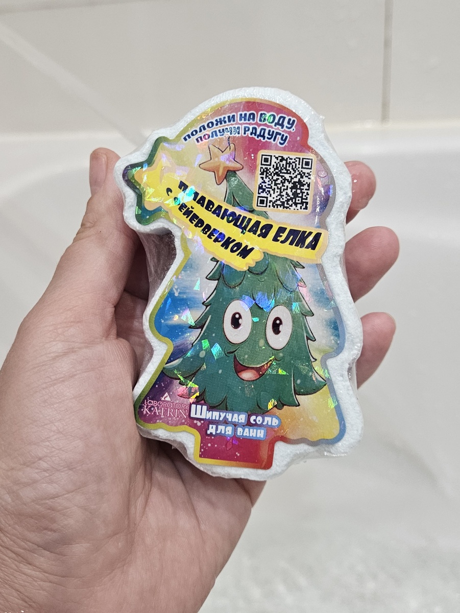 Всем привет! Сегодня пока вам прикольную бомбочку, которую мы нашли в местном косметическом магазине. Мы с дочкой плотно подсели на эти бомбочки. С ними купание становится любимым занятием и нескучным! Обычно берем шарики с игрушкой внутрт, но в этот раз решили поробовать совсем другой формат. Бомбочка была для нас загадкой, я такую даже не видела. Не знали, что же будет в ванной, что же там за фейерверк. Соль для ванн Laboratory Katrin Шипучая "Плавающая елка с фейерверком" Вес: 150 гр Производитель: г. Челябинск Бренд: Laboratory Katrin Бомбочка сделана в форме елочки. Летом, конечно, не в тему 😁, но она так заманчиво лежала в лотке с бомбочками, что мы не могли не взять. Вообще обычно я дочь подкатываю к лотку и она сама выбирает себе какие хочет. Вот и тут выбрала сама. Упаковка простая, как и у всех - запаяна в пленку и есть две этикетки - лицева и наклейка с информацией. Состав вообще минимальный: Sodium bicarbonate, Citric Acid, Sodium Laureth Sulfate, Glycerin, Maltod