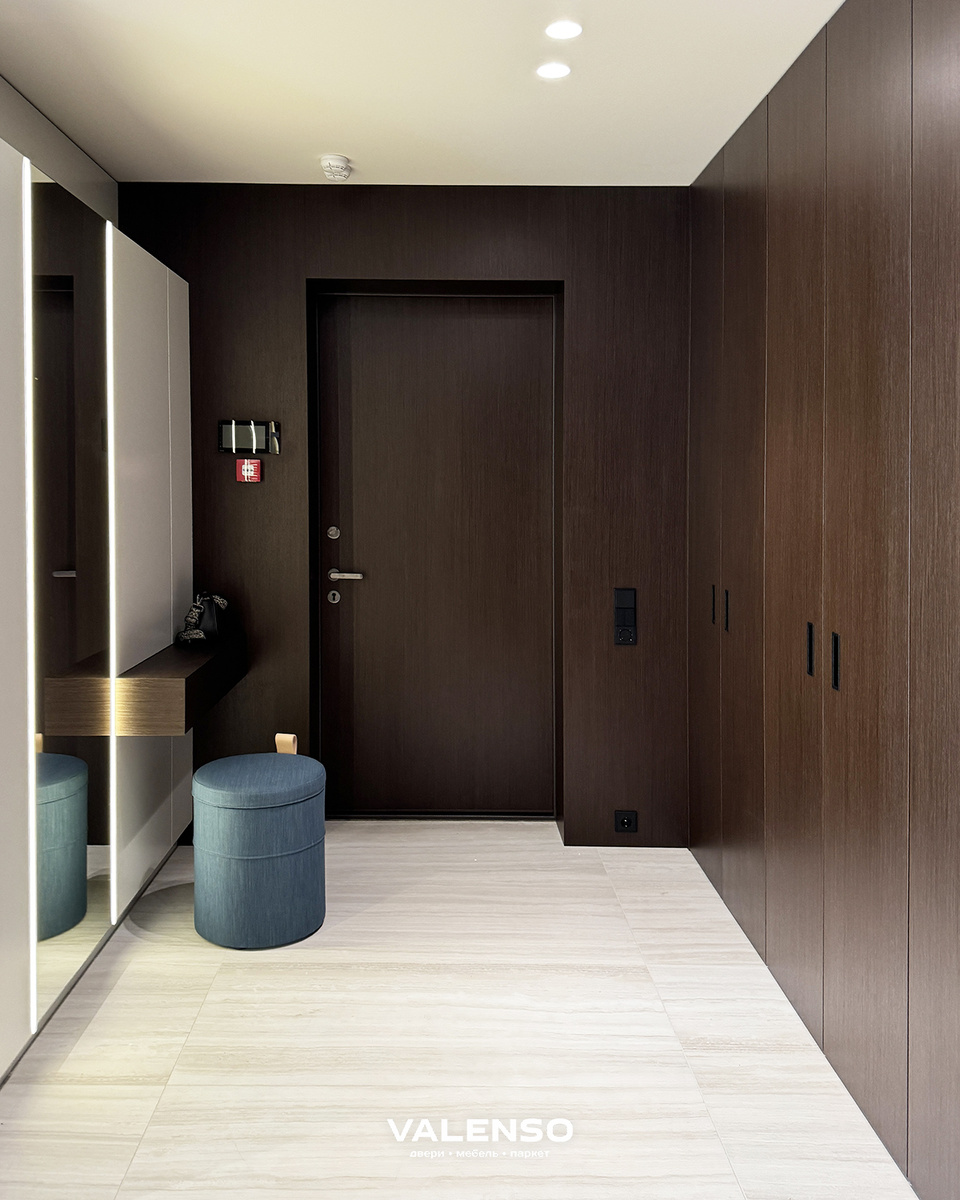 В прихожей этой московской квартиры, расположенной в ЖК Spires, мы реализовали продуманную композицию из платяных шкафов и элементов хранения. Все фасады и внутренняя отделка выполнены из натурального шпона, что придаёт пространству теплоту и ритмическую целостность. С противоположной стороны — подвесная консоль с выдвижным ящиком в той же отделке. За ней спрятан электрощит и открытые полки для хранения, скрытые за зеркальной дверью. Все элементы спроектированы таким образом, чтобы не перегружать интерьер, сохраняя при этом функциональность. Напротив входной двери открытые полки с мягкой подсветкой и откидной фасад внизу. Такое решение делает пространство визуально лёгким и технологичным. Интерьер реализован по проекту студии Rymar Studio.