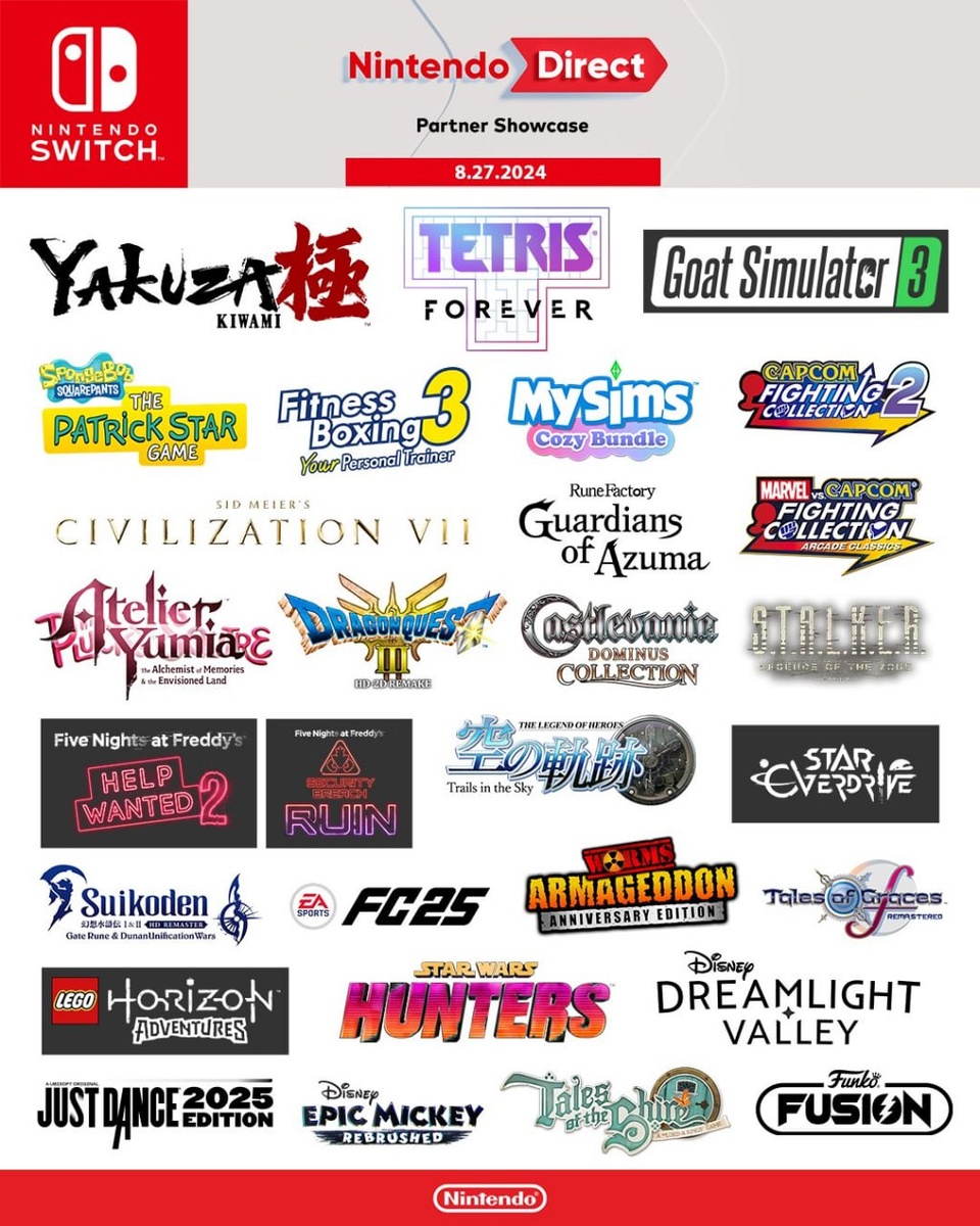 До Nintendo Direct Partner Showcase остался час! В честь этого вспоминаем, что показывали на последней партнёрской трансляции в августе прошлого года: Yakuza Kiwami, Civilization VII, Tales of Graces f Remastered и многое другое от сторонних разработчиков. Посмотреть новый шоукейс можно будет по ссылке. А в качестве сегодняшнего интерактива мы предлагаем не просто назвать игры, которые вы ожидаете увидеть, но написать в комментариях, какой анонс бы вас удивил и обрадовал больше всего?