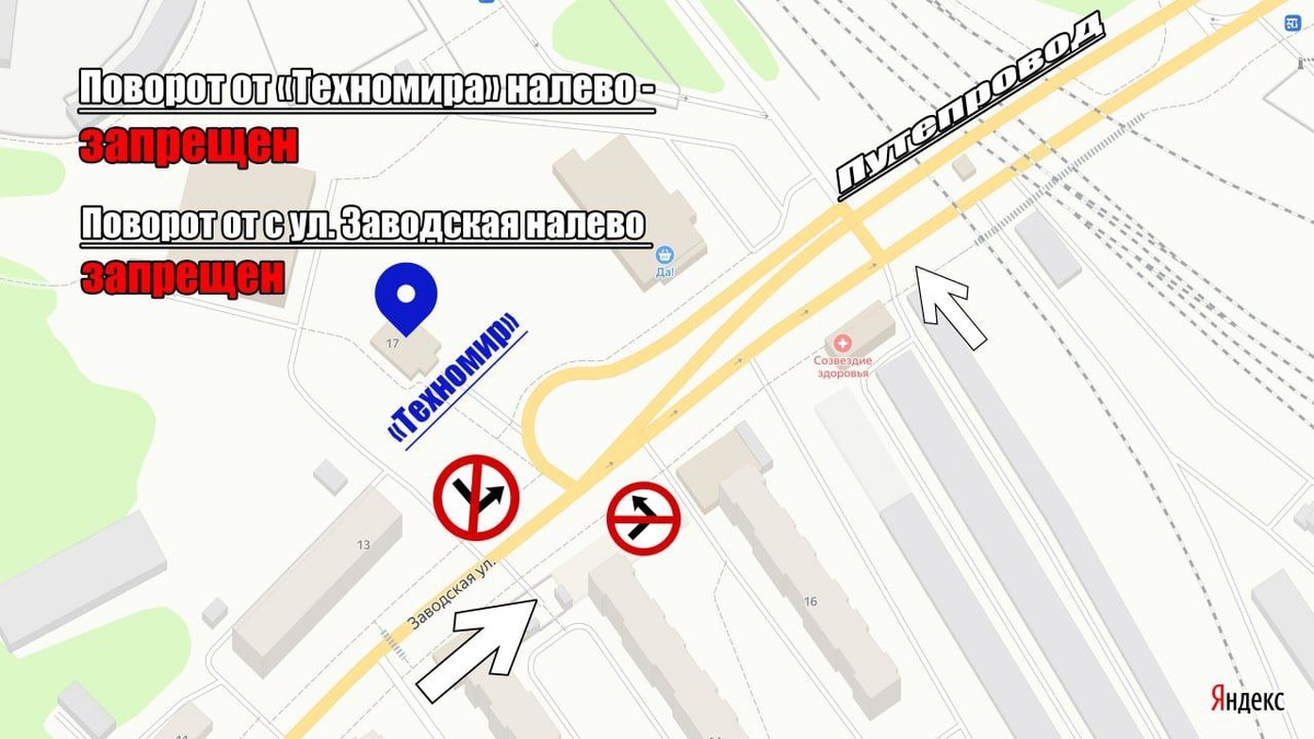 В районе нового путепровода действует временная схема движения. ❗️ Важные изменения: 🔹 Поворот налево с ул. Заводская — запрещён. 🔹 Поворот налево со стороны магазина "Техномир" — также запрещён. 🛣 Чтобы попасть к магазинам "ДА", "Техномир", а также на ул. Привокзальная, необходимо использовать развязку. Будьте внимательны на дороге и следуйте указателям!
