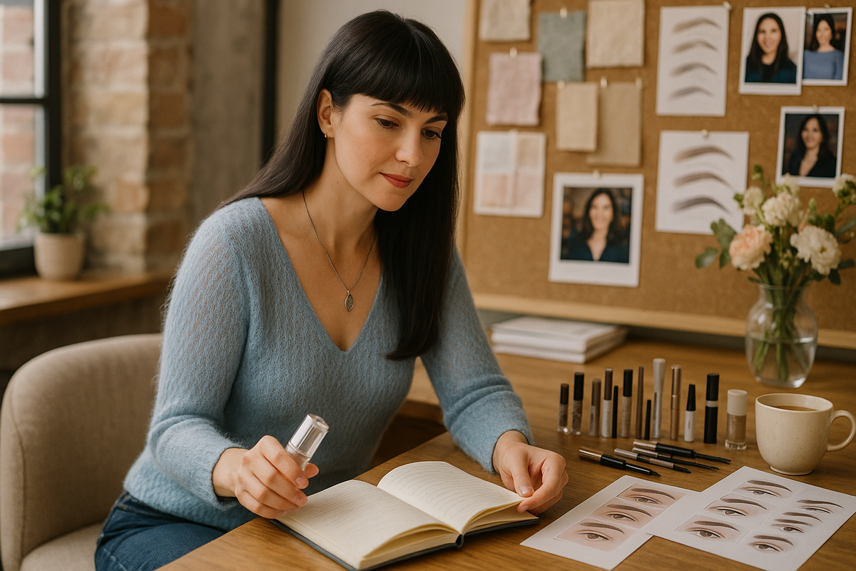 Перед началом моделирования коротко проанализируйте образ клиента: прозрачная пряжа, свободные рукава, нежная голубая гамма (как в приведённом wardrobe-описании) — всё это сигнал к тому, чтобы и брови были легкими, невесомыми, с есте