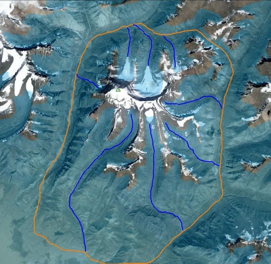 Спутниковое изображение Мандалы Кайласа. Оранжевая линия – кольцо внешней коры. Синие линии – русла рек, начинающихся у Кайласа. Голубой фон – горизонтальный срез на высоте 5600 м.