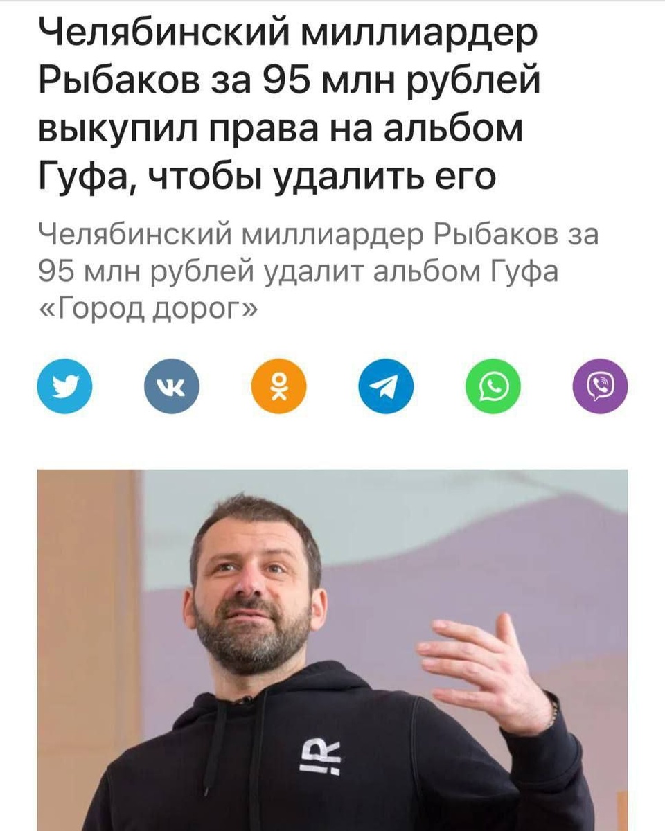 🤩Миллиардер Рыбаков выкупил права на альбом Гуфа «Город дорог» за 95 млн рублей, чтобы навсегда удалить его