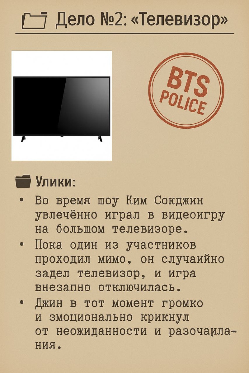 ⚡ Ознакомьтесь с делом! ‼️Не пишите ничего‼️ 🗂️ BTS: Легендарное Дело №2 "Телевизор" 📁 Официальный рапорт: Во время съёмок одного из шоу участник группы BTS Ким Сокджин был полностью погружён в прохождение видеоигры на большом экране. Однако всё пошло не по плану… 🕵️♀️ Улики: 1. Джин с энтузиазмом играл в видеоигру, сидя перед телевизором. 2. Один из участников случайно задел экран, проходя мимо, и игра внезапно отключилась. 3. Джин эмоционально вскрикнул от шока и отчаяния — момент получился настолько ярким, что рассмешил всех. 4. Сцена быстро разлетелась по фан-сообществам и стала мемом в Арми-среде. Начинаем расследование! Ознакомьтесь с делом — 🕵️ детективы Арми, готовьтесь угадывать: кто нарушил геймерский покой Джина? #vibang @kumihobts