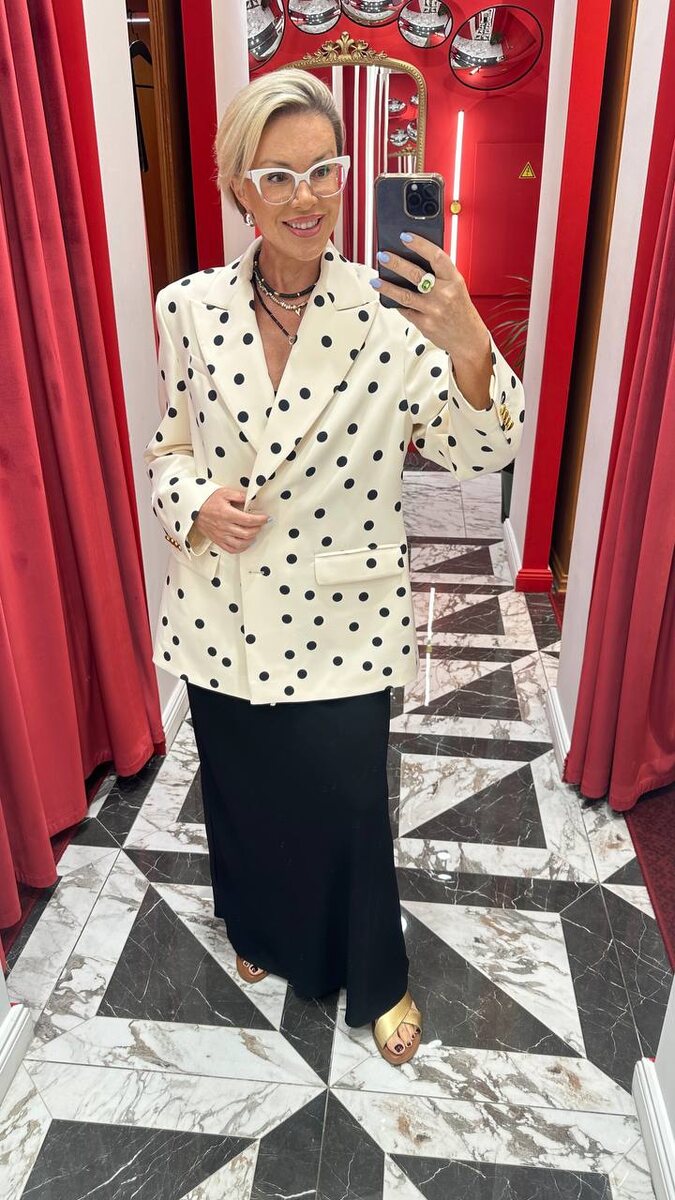 Здравствуйте, дорогие читатели! Где купить стильную и качественную одежду больших размеров? Если хватает средств, то однозначно в 4FORMS. Я давно люблю этот бренд и часто делаю оттуда обзоры для вас. У меня в гардеробе, кстати, немало вещей этого бренда, потому что размерный ряд начинается с 44-го размера. То есть подобрать одежду можно практически на любую фигуру. Сегодня покажу вам результаты моего недавнего шоппинга и оставлю ссылки на классные вещи с широким размерным рядом. Не забывайте ставить лайк за мои старания! Всегда любила принт горох, поэтому очень рада тому, что он сейчас в тренде. Показываю вам жакет, в который влюбилась. Он может стать стильным акцентом вашего образа. Приятный сливочный цвет, красивые пуговицы в форме цветов, идеальный размер горошин. Ссылка Классно будет смотреться и с ремнями. К жакету можно подобрать брюки для создания идеального комплекта. Я считаю, что такой образ достоин красной дорожки! Качественные широкие брюки со стрелками в том же цвете, что