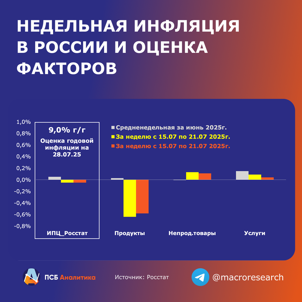 За минувшую неделю Росстат снова зафиксировал снижение индекса потребительских цен на 0,05%. Годовой уровень инфляции опустился до 9% г/г с 9,4% на конец июня.