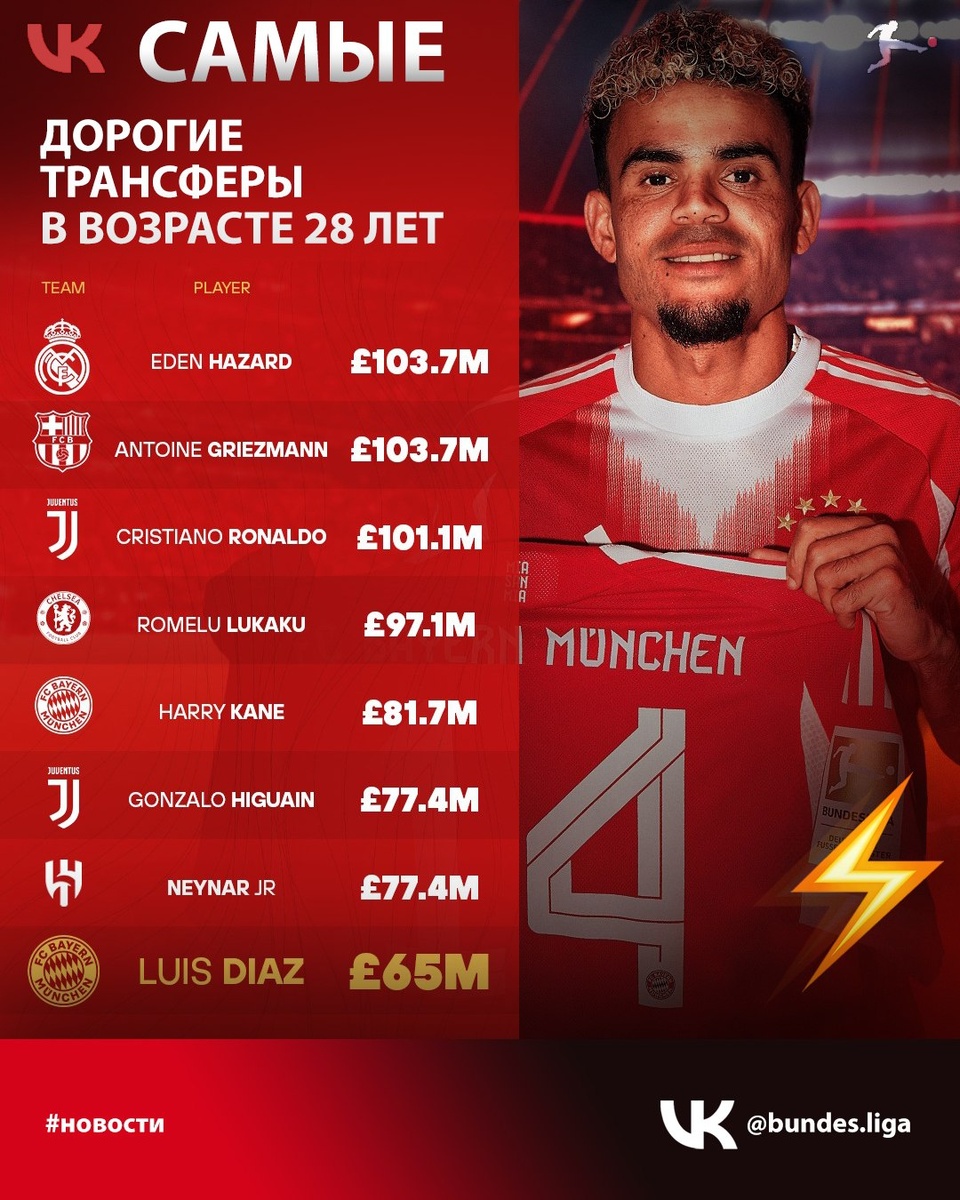 ⚡ После своего трансфера в Мюнхенскую «Баварию» Луис Диас стал 8-м самым дорогостоящим подписанием игрока в возрасте 28 лет.