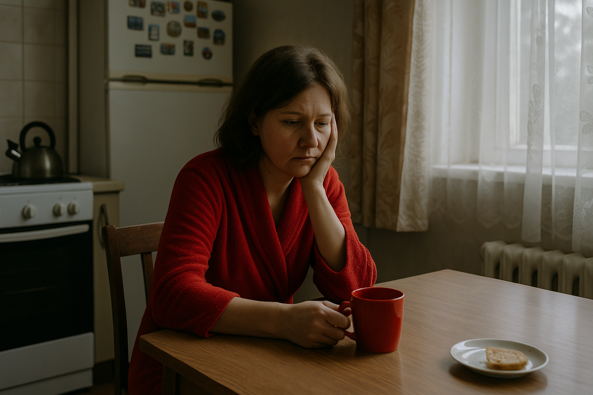 Меня ударило это "перестала быть женщиной". Странная формулировка, как будто женщина - это платье, каблуки, духи. А если ты в халате и с бигуди - то уже не женщина, а мебель. Удобная, привычная, но не возбуждающая.
