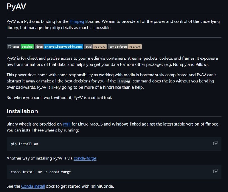 π§ PyAV β ΡΡΠΎ Python-Π±ΠΈΠ½Π΄ΠΈΠ½Π³ΠΈ Π΄Π»Ρ Π±ΠΈΠ±Π»ΠΈΠΎΡΠ΅ΠΊΠΈ FFmpeg, ΠΏΡΠ΅Π΄ΠΎΡΡΠ°Π²Π»ΡΡΡΠΈΠ΅ ΡΠ΄ΠΎΠ±Π½ΡΠΉ ΠΈ Β«ΠΏΠΈΡΠΎΠ½ΠΈΡΠ½ΡΠΉΒ» Π΄ΠΎΡΡΡΠΏ ΠΊ ΡΡΠ½ΠΊΡΠΈΡΠΌ ΠΎΠ±ΡΠ°Π±ΠΎΡΠΊΠΈ Π°ΡΠ΄ΠΈΠΎ ΠΈ Π²ΠΈΠ΄Π΅ΠΎ
