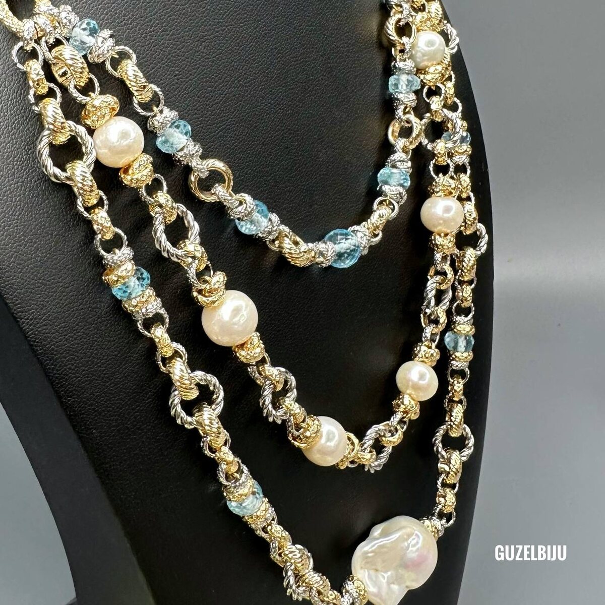 Бывает ли человек-плетук😂 когда я с цепочками, то я именно плетунья… хочется из них сумасшедшие вещички плести… закрыться в мастерской и наплести вам шарфов из цепей… Жемчуг отменного качества, голубые топазы (Индия) и узелочки разные специально для Натальи.