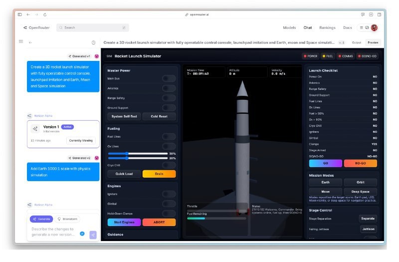 GPT-5 уже не за горами? На OpenRouter появилась модель Horizon Alpha, которая по ряду тестов даже без reasoning успешно конкурирует с ведущими нейронными сетями. Существует мнение, что Horizon — это ещё одна версия GPT-5. Эта модель прекрасно справляется с большими текстами и мгновенно создаёт сайты и приложения. Например, всего за минуту она сгенерировала реалистичный симулятор ракетных запусков. Наш уютный канальчик 🤖 Анимация | СhatGPT-4 | Помощь с резюме