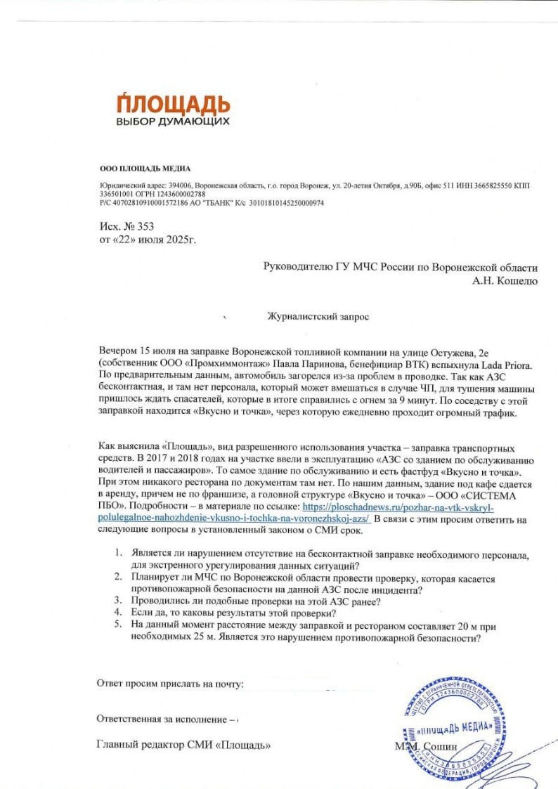 Главное управление МЧС России по Воронежской области прислало «Площади» ответ на запрос, который касался противопожарной безопасности на бесконтактной АЗС Воронежской топливной компании Павла Паринова. Речь идет о заправке на улице Остужева, 2е, которая находится в непосредственной близости к ресторану «Вкусно и точка» и через которую ежедневно проходит огромный трафик людей. В том числе, это семьи с детьми – заведение находится по близости с парком «Дельфин», а картошка фри так и манит юных воронежцев. Вопросы к специалистам МЧС у «Площади» появились неспроста. Именно здесь 15 июля вспыхнула Lada Priora. Ситуация осложнялась тем, что заправка является бесконтактной. Именно это привело к тому, что ЧП не удалось предотвратить в считаные минуты. Чтобы потушить машину, пришлось ждать спасателей, которые смогли справиться с огнем за девять минут и чудом не дали огню перекинуться на здание кафе. Более того, «Площадь» выяснила еще один факт: вид разрешенного использования земли, на котором р