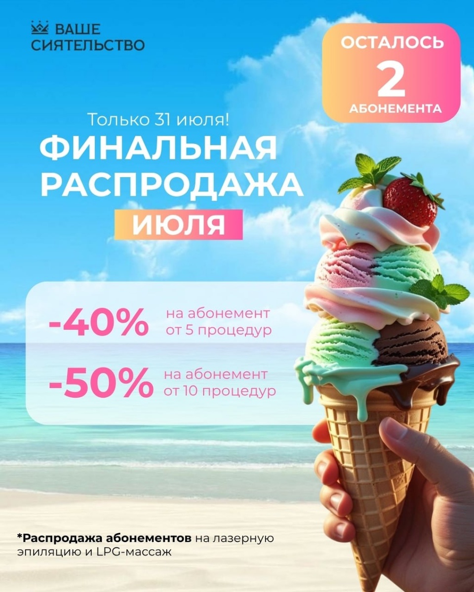🎶🔥 ФИНАЛЬНЫЙ АККОРД ИЮЛЯ 🔥 🎶 Только сегодня 31 июля — на ОДИН день мы продлеваем феерию скидок. Сногсшибательные цены на лазерную эпиляцию и LPG массаж, которые плавятся, как мороженое в жару: 💥 — скидка 40% – на абонемент от 5 процедур 💥 — скидка 50% – на абонемент от 10 процедур НО 🚨 Осталось ВСЕГО ДВА абонемента! 2 🤯 Кто успел, тот и забрал гладкую кожу и подтянутое тело по супер-цене! 🔜 Города-участники: Алушта, Симферополь, Кисловодск, Великий Новгород, Екатеринбург (Вторчермет) Пишите прямо сейчас https://t.me/vashesiyatelstvo