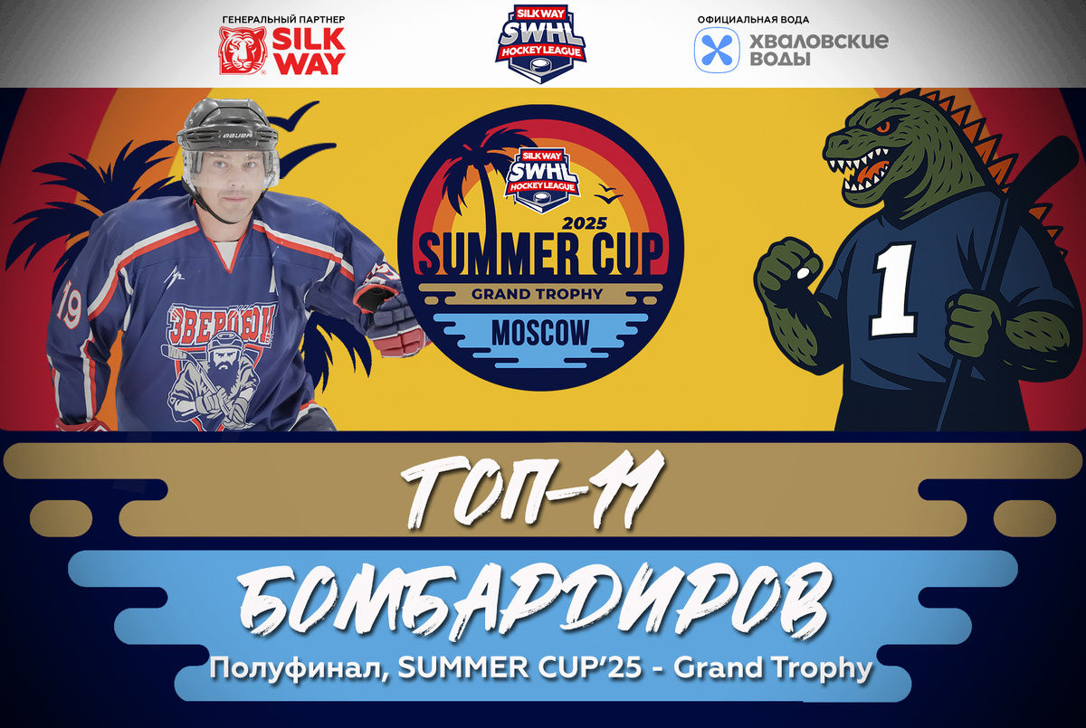 ТОП-11 БОМБАРДИРОВ ПОЛУФИНАЛОВ SUMMER CUP’25 — GRAND TROPHY Полуфиналы Grand Trophy стали лакмусовой бумажкой для команд, у которых амбиции не заканчиваются на групповом этапе. Когда за спиной уже июль, но впереди — только один матч до заветного финала, раскрываются те, кто умеет играть не просто сильно, а по-настоящему громко. Те, кто чувствует игру, как музыку. Кто дышит ею. Именно они — в нашем свежем Топ-11 лучших бомбардиров полуфинальной стадии SUMMER CUP’25 — Grand Trophy. И на этот раз в списке правят… «Зверобои». Сразу семь (!) позиций в рейтинге заняли представители команды, которая не просто обыграла, а разнесла действующих чемпионов Silk Way Star со счётом 10:3. Это была не просто победа — это было хоккейное землетрясение. На вершине индивидуального зачёта — Александр Белоусов. Его полуфинальный вклад — 5 очков (1+4). Он будто дирижировал атакой «Зверобоев», превращая каждый выход вперёд в остроту и угрозу. На втором месте — Артём Галашев. 4 результативных балла (2+2), кажд