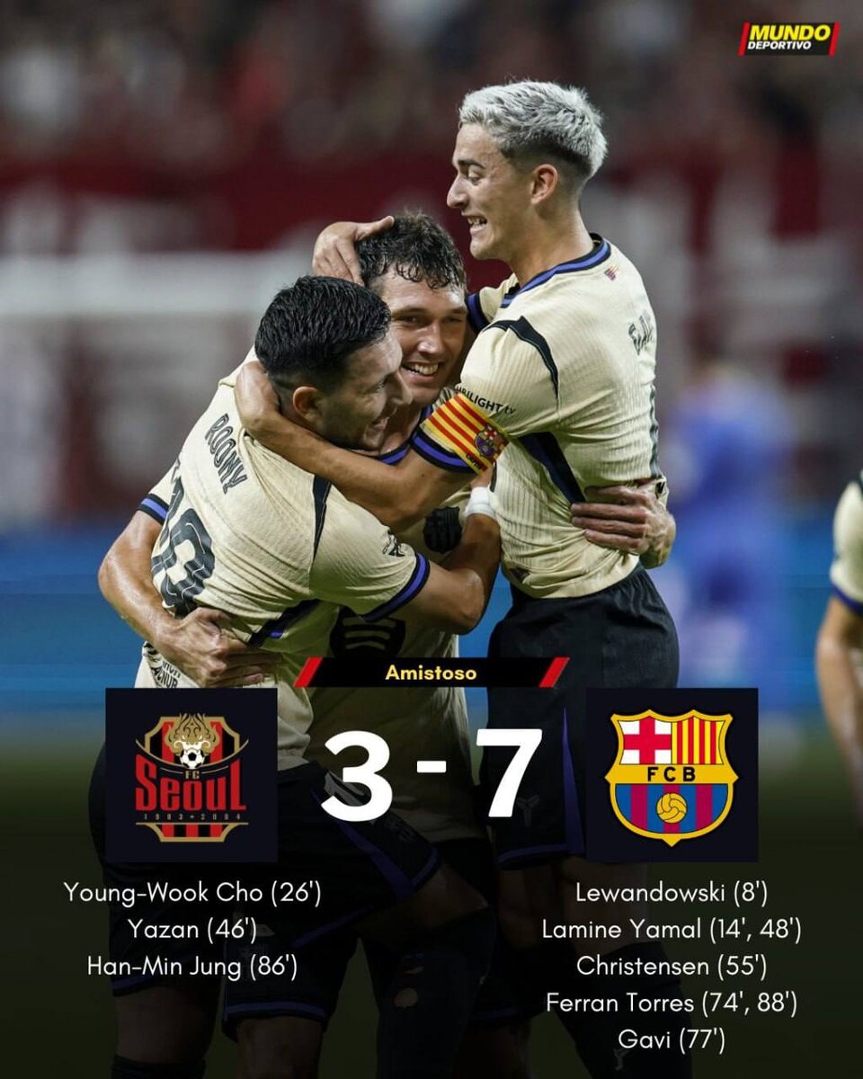 Итог: 7:3 – 10 голов, сумасшедший темп и два дубля 📌 Ключевые моменты ✅ Барселона владела мячом 68%, но пропустила 3 гола из-за экспериментов с защитой ✅ Сеул показал характер – все 3 гола после контратак Ким До-Хун: 《Горжусь тем, как мы атаковали. Такой опыт бесценен перед Лигой чемпионов Азии》 Ламин Ямаль: «Забить гол в этой футболке, с 10 номером на спине, — это мечта»