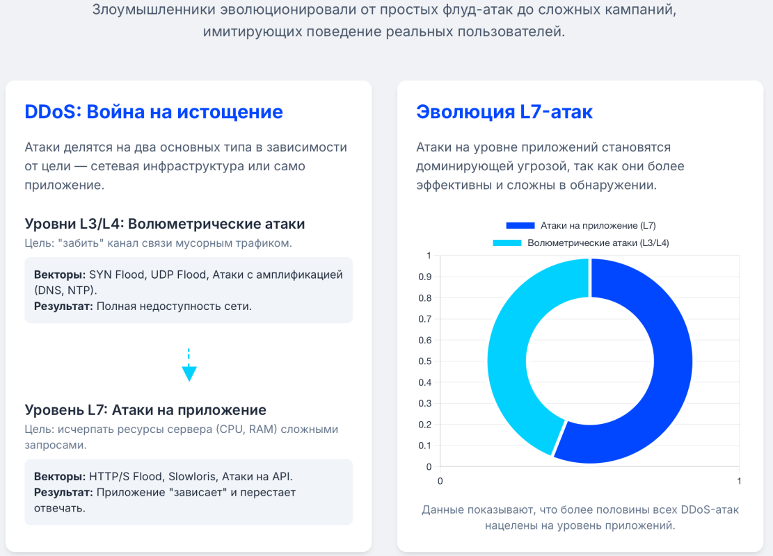 Анализ текущего ландшафта угроз выявляет четкую и важную тенденцию: происходит постепенный, но неуклонный сдвиг от примитивных волюметрических атак к более сложным и интеллектуальным атакам на уровне приложений. Если раньше основной задачей защиты было наличие «трубы» шире, чем у атакующего, то сегодня этого уже недостаточно.