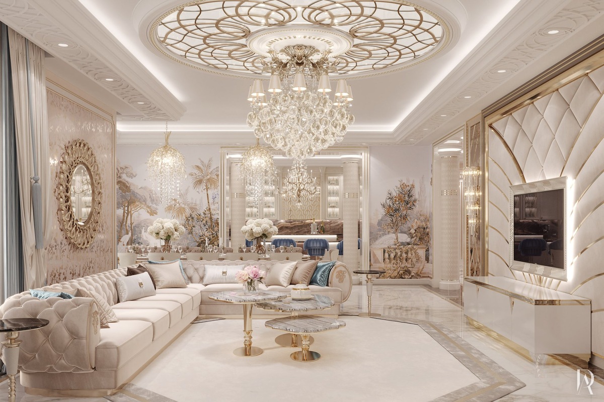 Нежные светлые тона (кремовые, молочные, жемчужные) и обилие золота позволило создать в этом доме по-настоящему дворцовую атмосферу. Пол из отполированного до блеска светлого мрамора и дизайнерская люстра с хрустальными подвесками напоминают о бальных залах. Крупная витражная потолочная розетка создает иллюзию второго света. Камин с мраморной облицовкой дарит уют. А итальянский угловой диван с низкой спинкой, украшенный золотистым цоколем и каретной стяжкой, дает легкий отсыл к культовой модели Честерфилд.