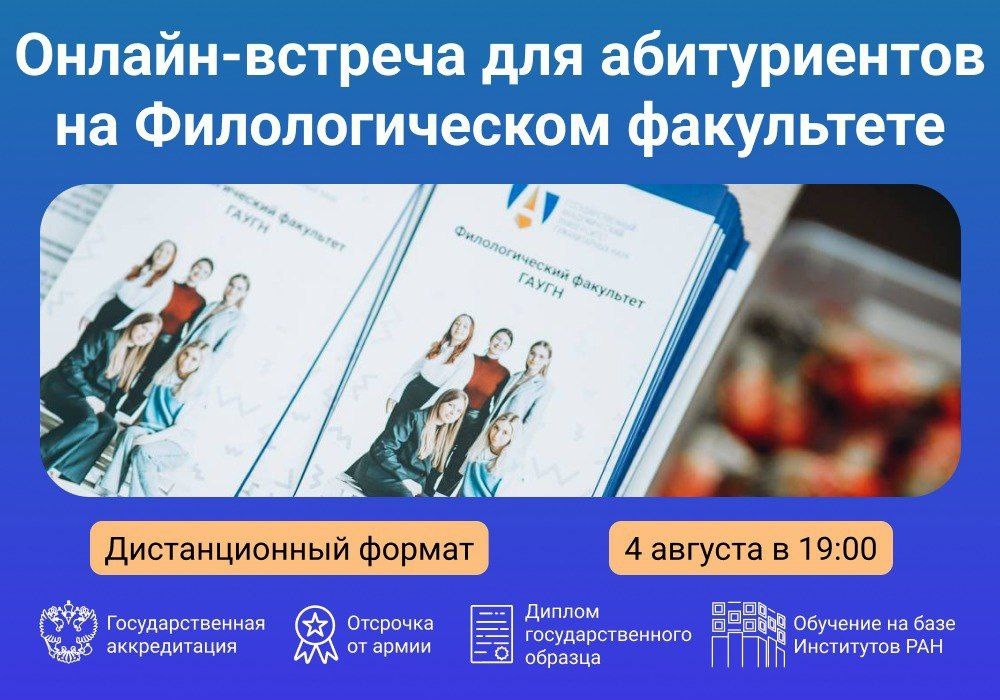 Онлайн-встреча с деканом Филологического факультета 4 августа приглашаем абитуриентов и их родителей на онлайн-встречу с деканом Филологического факультета ГАУГН! 👀 На мероприятии вы узнаете всё о факультете, условиях приема, о преимуществах и содержании образовательных программ по Лингвистике, о возможностях индивидуализации студенческих образовательных траекторий, о научной и творческой внеучебной деятельности студентов. 📆 Дата и время: 4 августа в 19:00. 📍 Формат: онлайн по ссылке. ❗️ Регистрацию на мероприятие можно пройти по ссылке. Ждём вас в ГАУГН! #филологиГАУГН #день_открытых_дверей #абитуриенты25 #простРАНство_ГАУГН #gaugn_priem