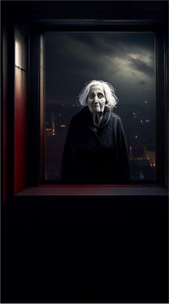 Силуэт вдруг замер и поднял голову, словно услышал мальчика. Фонарь, неожиданно зажегся, и мальчик увидел пожилую женщину во всём чёрном, и чёрном платочке на голове. Она смотрела прямо на него. Затем фонарь мигнул и выключился.