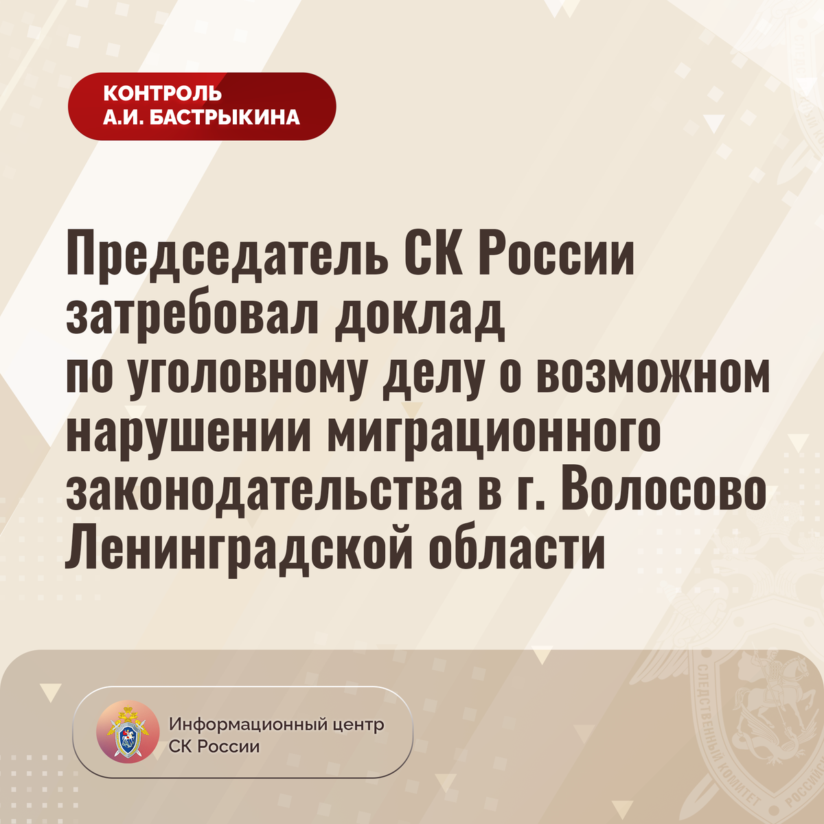Председатель СК России затребовал доклад по уголовному делу о возможном нарушении миграционного законодательства в г. Волосово Ленинградской области В приёмную Председателя СК России А.И. Бастрыкина «ВКонтакте» поступило обращение по вопросу возможного нарушения миграционного законодательства в городе Волосово Ленинградской области. В одном из домов, длительное время находившимся в заброшенном состоянии, с июля текущего года стали проживать не менее десяти мигрантов. По мнению заявителя, приезжие незаконно находятся на территории страны. В СУ СК России по Ленинградской области по поступившему обращению возбуждено уголовное дело. Председатель Следственного комитета Российской Федерации Александр Иванович Бастрыкин затребовал у руководителя СУ СК России по Ленинградской области Сергея Тихоновича Сазина доклад об установленных в ходе первоначальных следственных действий обстоятельствах, а по завершении расследования уголовного дела - о его результатах. Исполнение поручения поставлено на к