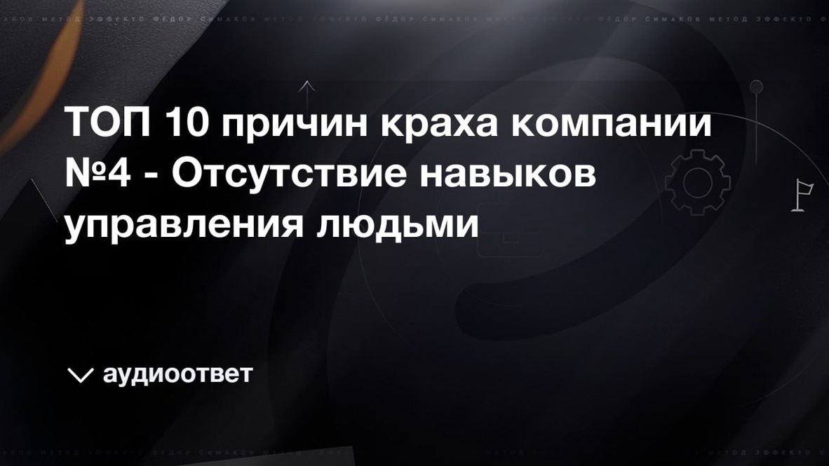Подробный аудио-ответ вы можете прослушать в нашем телеграмм канале! №4: Отсутствие навыков управления людьми Часто предприниматели не обладают необходимыми навыками управления. Выйдя из роли наёмного сотрудника или работая самостоятельно, они решают реализовать свою идею и запускают бизнес. Однако, для роста необходимо нанимать сотрудников, что требует навыков управления, подобных навыкам вождения автомобиля или велосипеда. ❌ Основная проблема - низкая эффективность персонала при высоком фонде оплаты труда. ▫️Симптомы: Ежемесячная головная боль из-за необходимости собирать деньги на зарплаты, при этом чувство обиды - сотрудники получают зарплаты, а владелец нет. ✔️Решение - повышение эффективности. ▫️Анализ эффективности сотрудников: Определите, кто не выполняет KPI. Например, Вася работает хорошо, а Петя нет. Решение: либо обучить Петю, либо заменить его. ▫️Оптимизация бизнес-процессов: Возможно, сотрудники не могут работать эффективно из-за неэффективных бизнес-процессов. Наладьте и