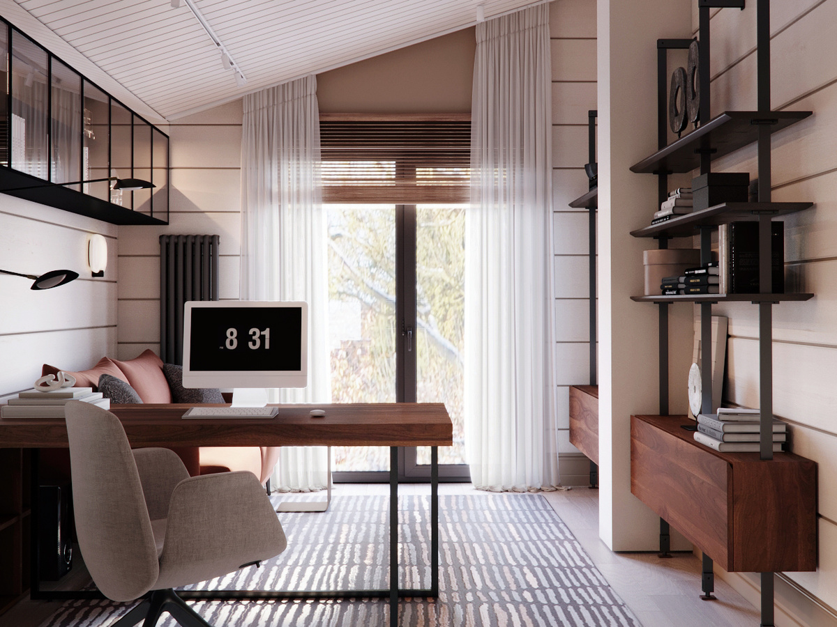 Интерьер кабинета мы выстроили как многофункциональное пространство. У окна расположено рабочее место с минималистичным креслом — его сиденье вращается на стационарном основании. Напротив — уютный диван в тёплой бежевой обивке с декоративными подушками и небольшим приставным столиком. Над диваном — ряд подвесных шкафов с тонированными стеклянными фасадами и подсветкой, создающими атмосферу уединения и порядка. На противоположной стене размещены телевизор и стеллажная система в актуальном дизайне: открытые полки на чёрном металлическом каркасе и консольные модули из натурального дерева. Такое решение подчёркивает архитектурную ритмичность и добавляет интерьеру графичности. Пространство кабинета легко адаптируется под разные сценарии: стол может использоваться не только для работы, но и как центр досуга. Диван и дополнительные стулья превращают комнату в зону для дружеских встреч и настольных игр. Такое сочетание функций делает интерьер удобным и гибким — в духе современного ритма жизн