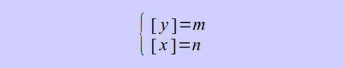 Изобразить на плоскости множество точек, координаты которых удовлетворяют системе (m, n – целые числа): (под целой частью числа t понимается наибольшее целое число, не превышающее заданное; её принято обозначать при помощи квадратных скобок: [t]; функция f(t) = [t] определена на всём множестве действительных чисел). С учётом того, что решения уравнения [t] = k (k ∈ ℤ) является полуинтервал t ∈ [k; k + 1) (см. задание А-30), можно записать На плоскости множество точек, координаты которых удовлетворяют условию y ∈ [m; m + 1) представляет область в виде горизонтально направленной полосы, причём нижний край полосы (y = m) будет входить в область, а верхний – нет, потому что вторая часть двойного неравенство y < m+ 1 является строгой (рис. 1). Аналогично, точки с координатами, соответствующими требованию x ∈ [n; n + 1), на плоскости образуют вертикальную полосу, «левая» граница которой входит в её область, а правая – нет. Знак системы означает требование одновременного выполнения ряда усл