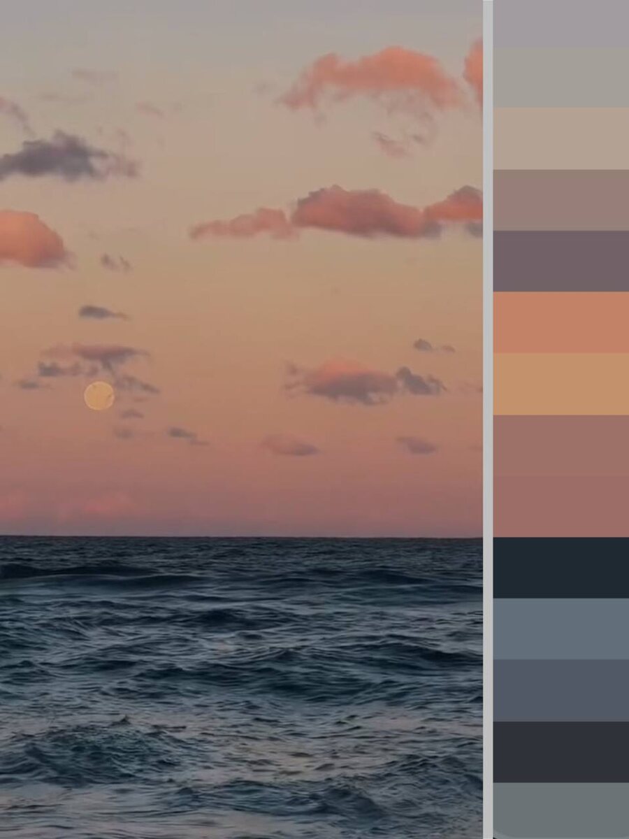 Тепло растворяется в волнах, отражается на горизонте и разлито в воздухе. Прохлада глубины мягко уравновешивает оттенки уходящего дня. Пауза между дневной суетой и вечерним покоем.
