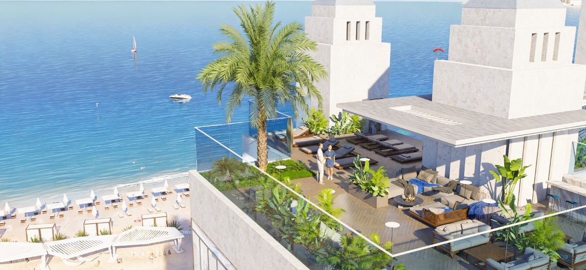 Дорога переносится за отель. Гости отеля выходят из отеля и напрямую попадают на пляж с белым песком...