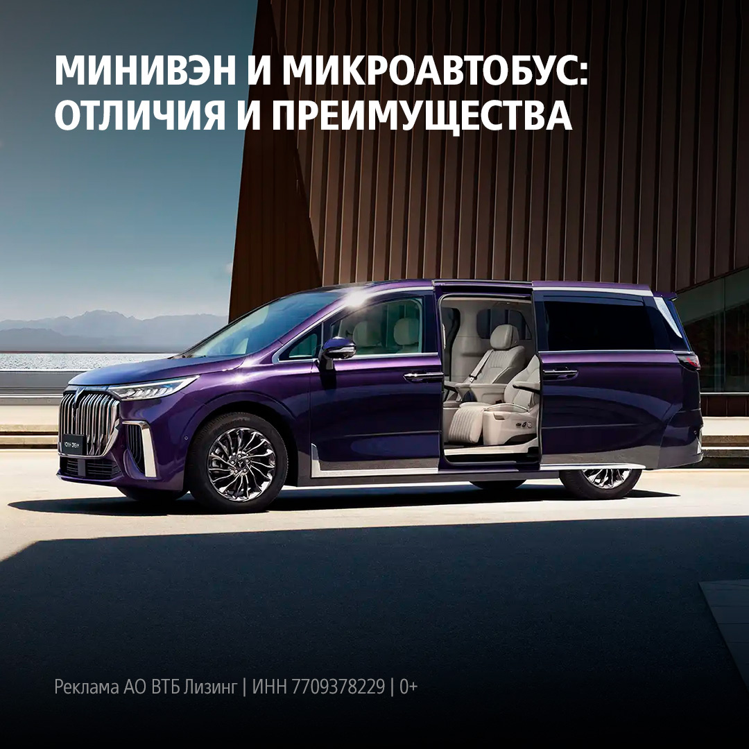 Микроавтобус или минивэн? В чём разница между ними, и какой вариант подойдёт вам? Минивэн — это большой легковой автомобиль, который вмещает 7-8 пассажиров. Сиденья в минивэне обычно расположены в три ряда, а высотой он не очень отличается от других просторных легковушек. Такая машина отлично подойдёт тем, у кого большая семья, а также для комфортных деловых поездок: места хватит всем. Для управления минивэном нужны обычные водительские права категории B. Микроавтобус — это уже лёгкий коммерческий транспорт, вмещающий от 9 до 15 пассажиров и более. В нём несколько рядов сидений, иногда с проходом между ними. Высота потолка позволяет стоять в полный рост. Микроавтобусы востребованы в сфере пассажирских перевозок или для доставки персонала и небольшого количества багажа. Для управления микроавтобусом необходимы права категории D1 или D, в зависимости от количества пассажирских мест. Выбираете между минивэном и микроавтобусом? Обратитесь в ВТБ Лизинг, и мы подберём оптимальный вариант на