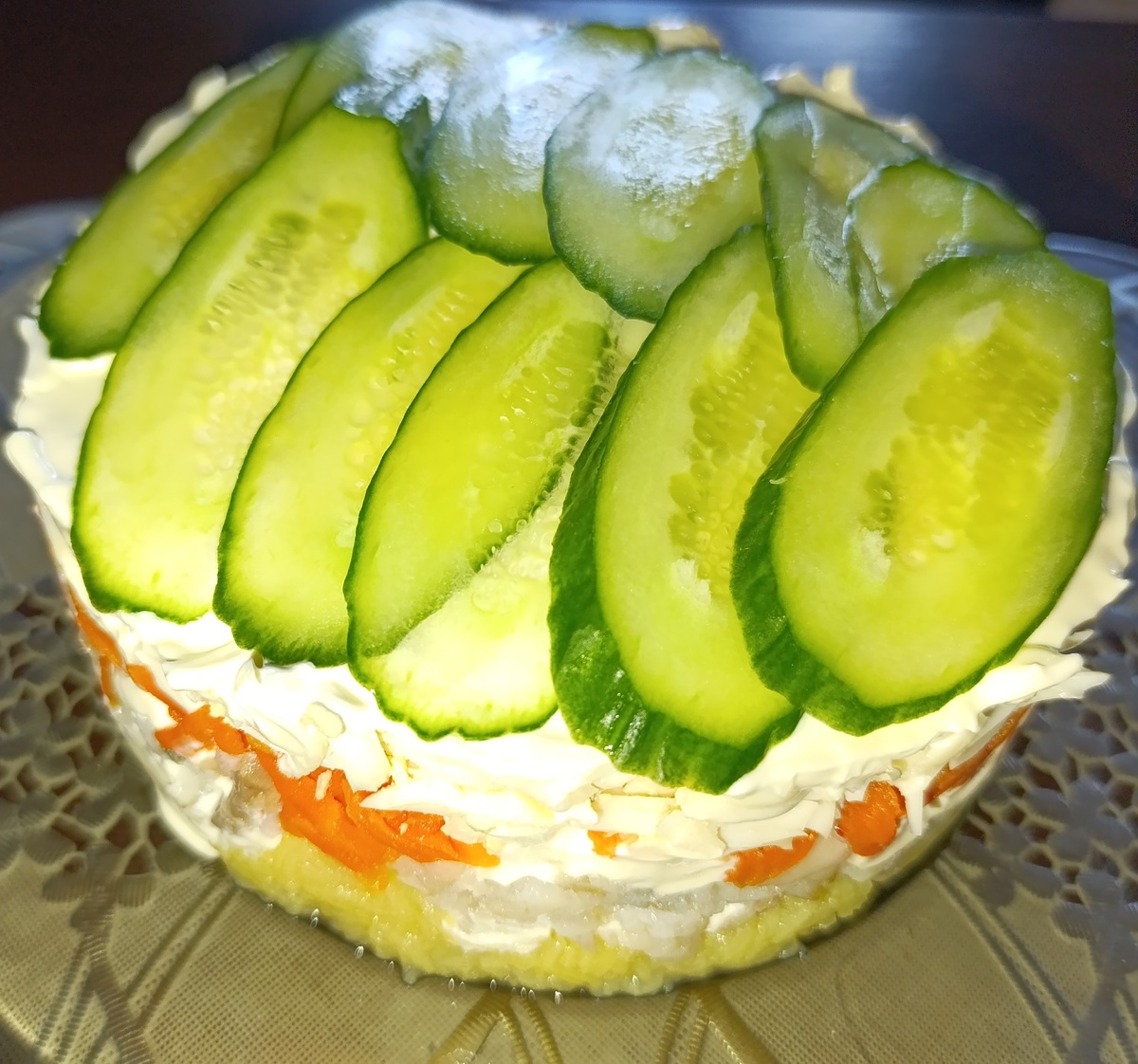 Ингредиенты: филе трески 300 гр картошка 3 шт яйца 3 шт морковь 2 шт майонез лавровый лист 2 шт перец горошком 7 шт соль 1 ч л слайсы огурцов для украшения Отвариваем овощи и яйца. Филе трески отвариваем 15 минут в соленой воде с добавлением лаврового листа и перца. В кулинарное кольцо выкладываем натертую на мелкую терку картошку, сверху промазываем майонезом. Сверху выкладываем отваренную треску. и промазываем майонезом. Далее слой натертой моркови и снова промазываем майонезом. Сверху натертые яйца. Промазываем майонезом. Сверху украшаем слайсами огурца. Приятного аппетита!
