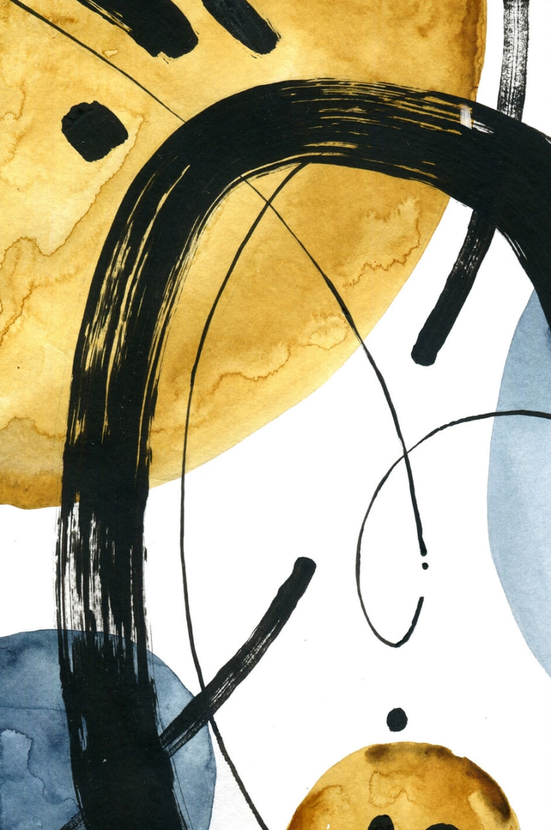 Это динамичная композиция, в которой цвет и линия играют ведущие роли. Теплые охристые пятна сталкиваются с холодными синими формами, создавая ощущение ритма и движения. Контрастные черные мазки придают структуру, а тонкие линии направляют взгляд зрителя по всей поверхности изображения. Работа вызывает эмоциональный отклик через взаимодействие форм и визуальный пульс. Это произведение обращается к внутреннему восприятию, а не к внешнему сюжету.