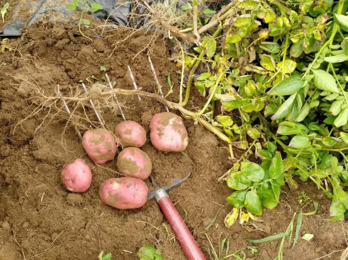 - Инструмент имеет значение: 🪓 Вилы с тупыми концами (или специальные картофельные вилы) меньше повреждают клубни, чем лопата. Копайте аккуратно, отступив от куста, поддевая ком земли снизу.