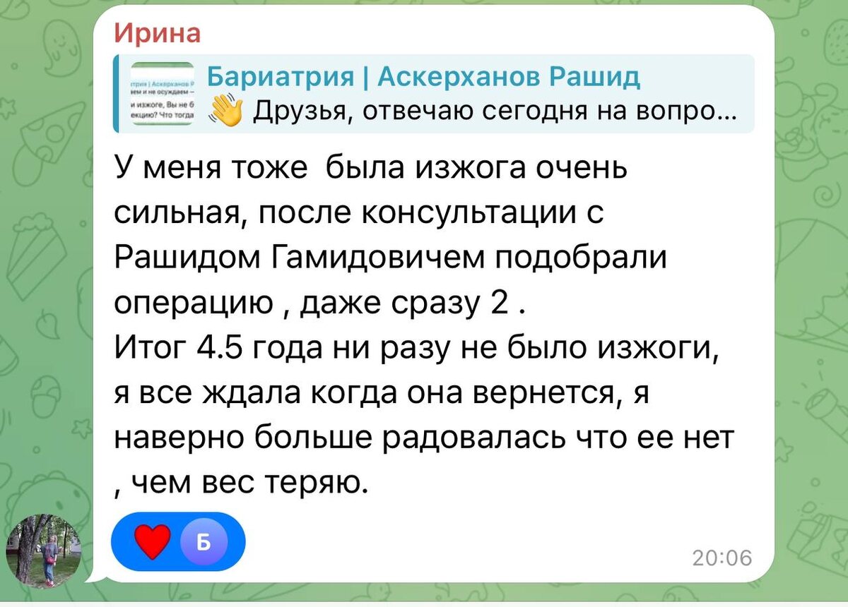 По секрету скажу: у нас есть специальная методика, которая позволяет снизить симптомы изжоги или избавить от нее полностью. Установка манжетки — это наша уникальная технология, которая разработана в МКНЦ. Она входит в стоимость операции для пациентов с изжогой. Вообще, у нас много уникальных возможностей для пациентов 😉 Мы первые в России привозим новое оборудование, новые методики. Например, эндоскопическая гастропликация, о которой я рассказывал здесь 👉🏻 https://t.me/Bariatricmos/711