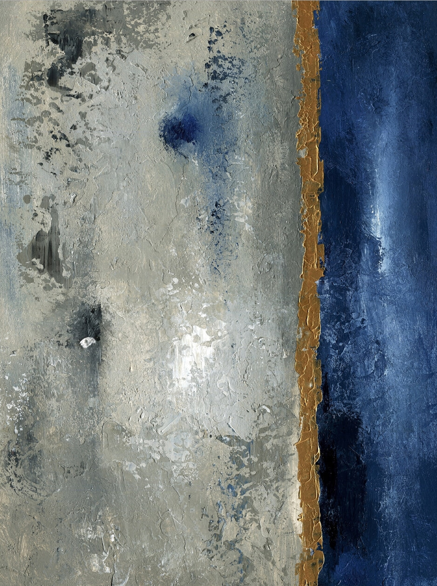 Это напряжённый диалог цвета и текстуры. Левая часть картины насыщена бледно-серыми и песочными оттенками с вкраплениями угольно-чёрного, словно следами времени. Справа — глубокий синий с массивной фактурой и вертикальной линией охры, разделяющей композицию. Переход между частями выглядит резким, создавая визуальное ощущение береговой линии. Картина держит внимание своей грубой поверхностью и сбалансированной асимметрией.